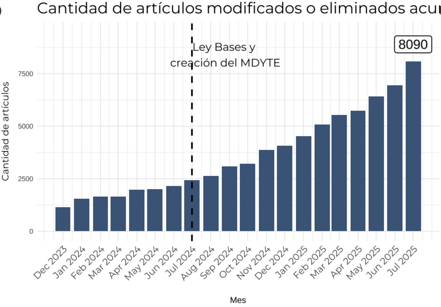 “WE CONTINUE WITH DEREGULATION. There are so many obstacles we've removed that it's hard to quantify them. The graph shows the number of articles that repeal, eliminate, or simplify regulations since @JMilei took office. The road ahead is long, but we move forward every day.”