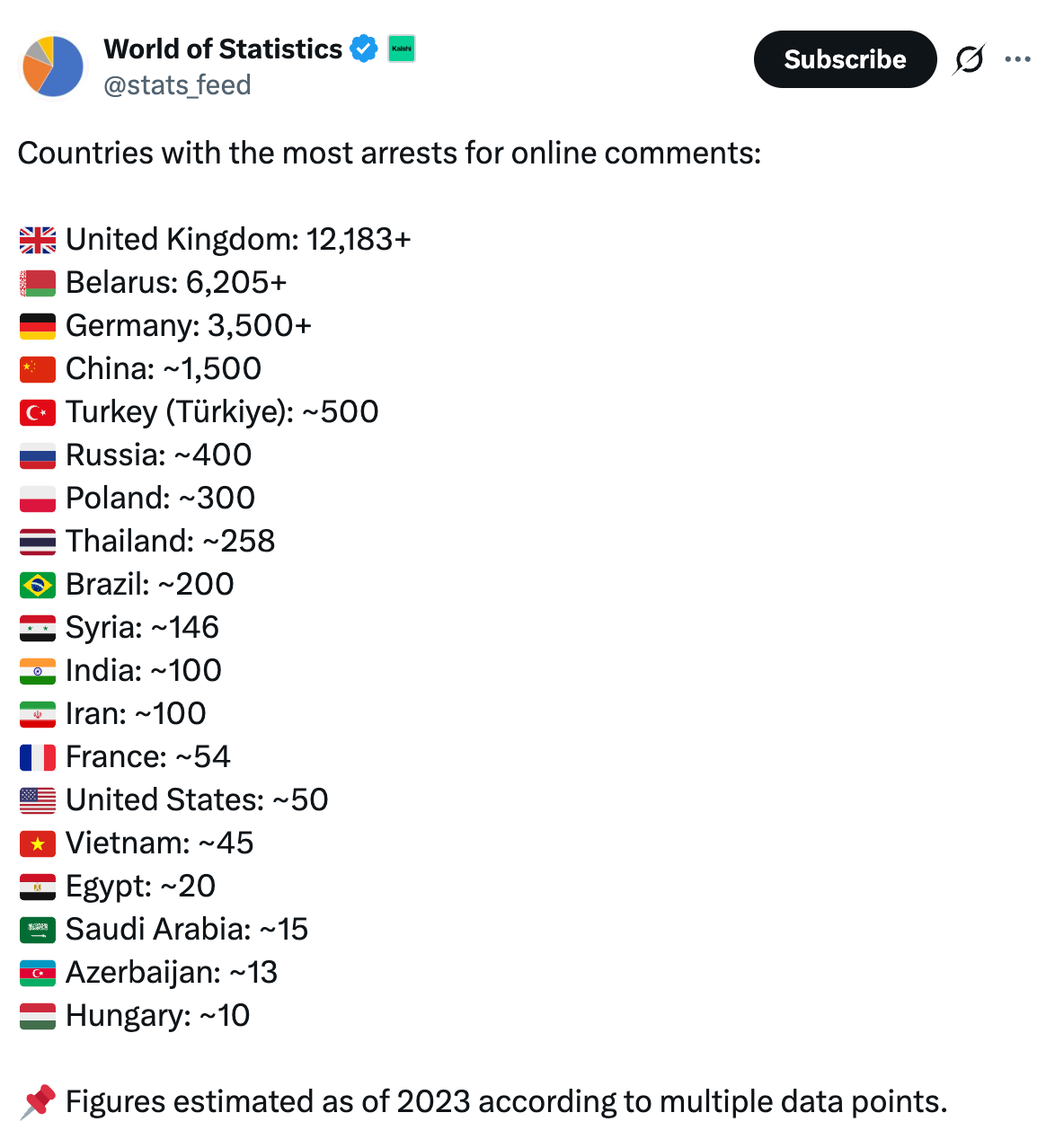 For comparison, the Chinese government made ~1,500 arrests during the same period... Russia made ~400... France 54... and the Kingdom of Saud, that renowned bastion of civil liberties, 15. Here’s the breakdown, from World of Statistics: