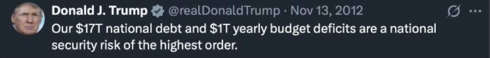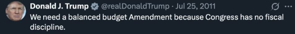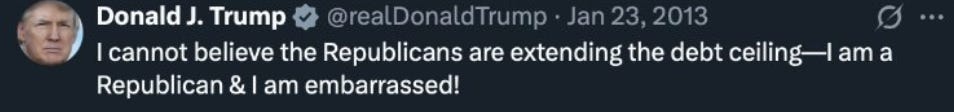 Great piece Joel. Thank you for exposing DJT's ability to change course without batting an eye. His 2013 tweet that as a Republican he is embarrassed that Congress would allow the debt ceiling to be raised. He is now pleased to support Elizabeth Warren on raising the debt limit. How can anyone take the man seriously? Elon Musk clearly does not. I expect a number of followers to lose faith in one who blows with the wind.