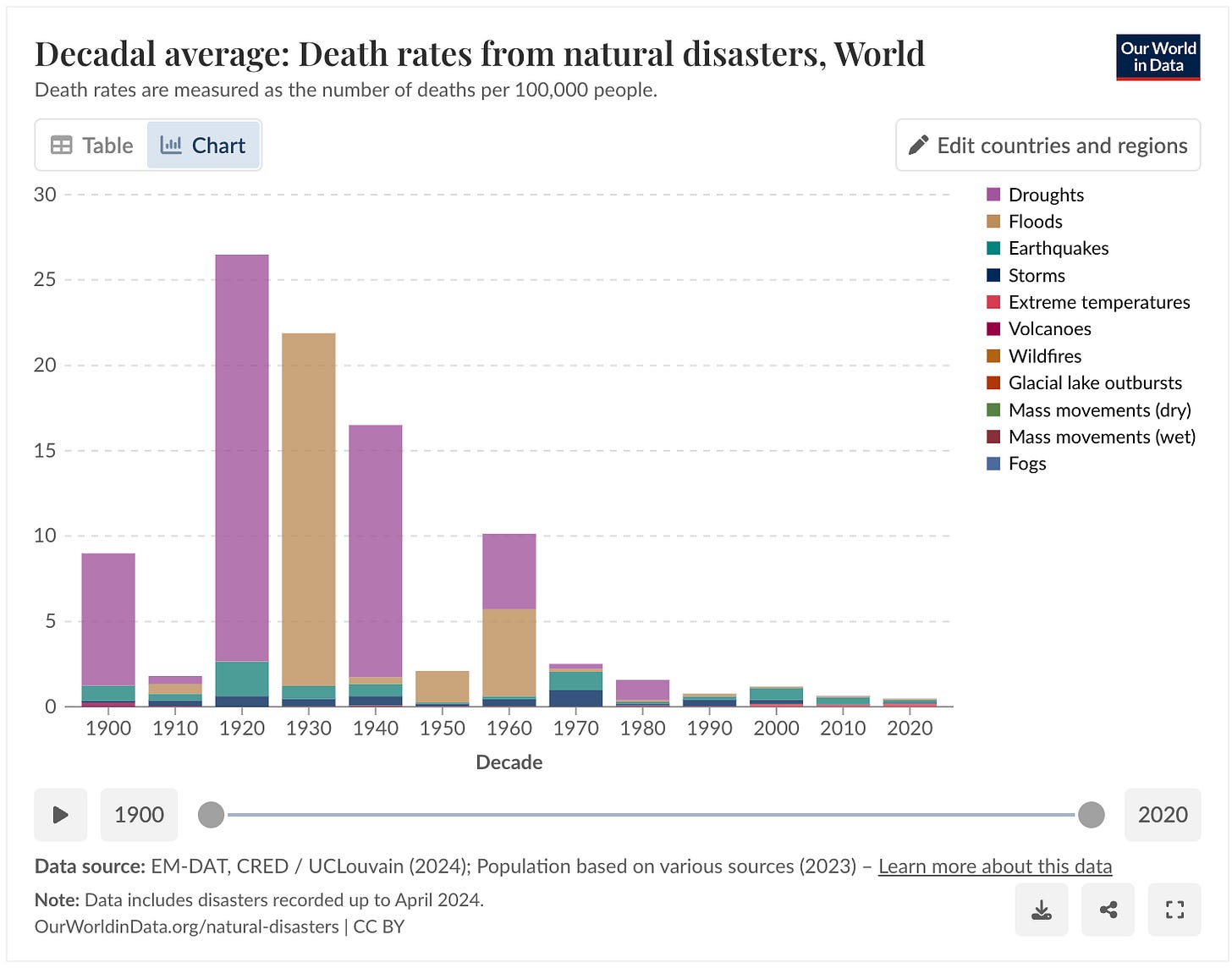 Meanwhile, death rates from natural disasters – including droughts, floods, extreme temperatures, wildfires, glacial lake outbursts, etc. – are collapsing. In the decade from 1920-1930, 26.5 people per one hundred thousand died from such catastrophic events. The rate a century on: less than half a person per thousand...a non-trivial 98.11% reduction.