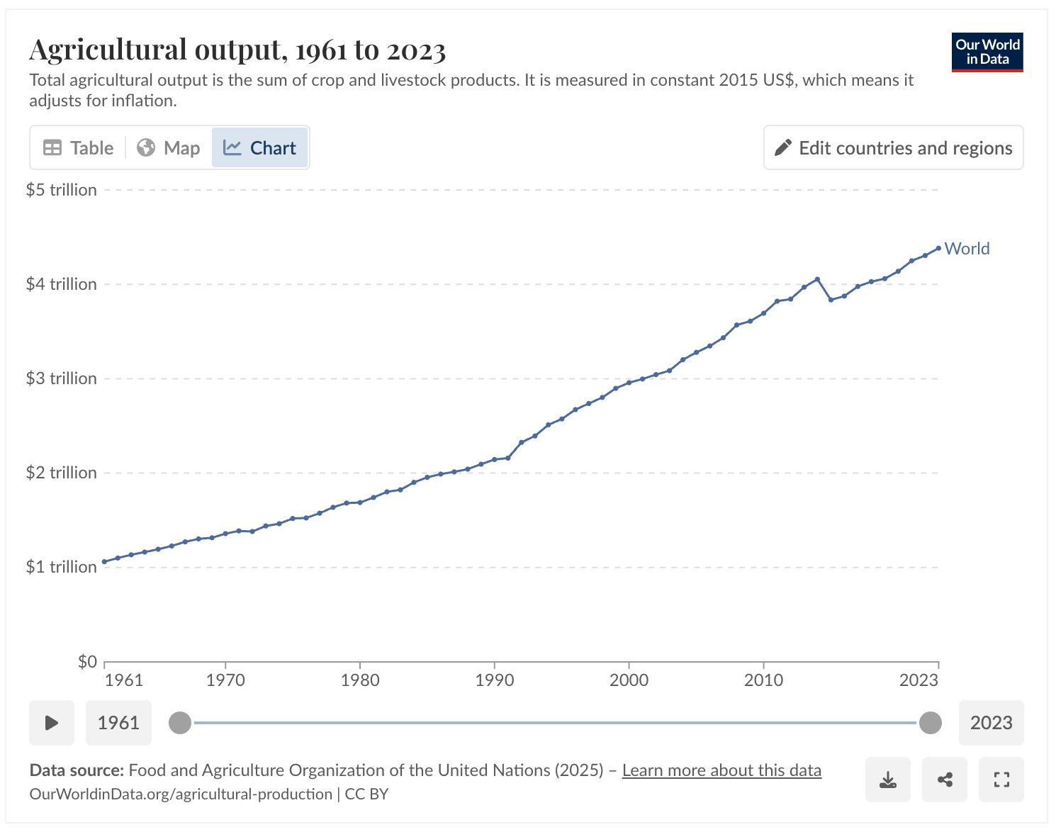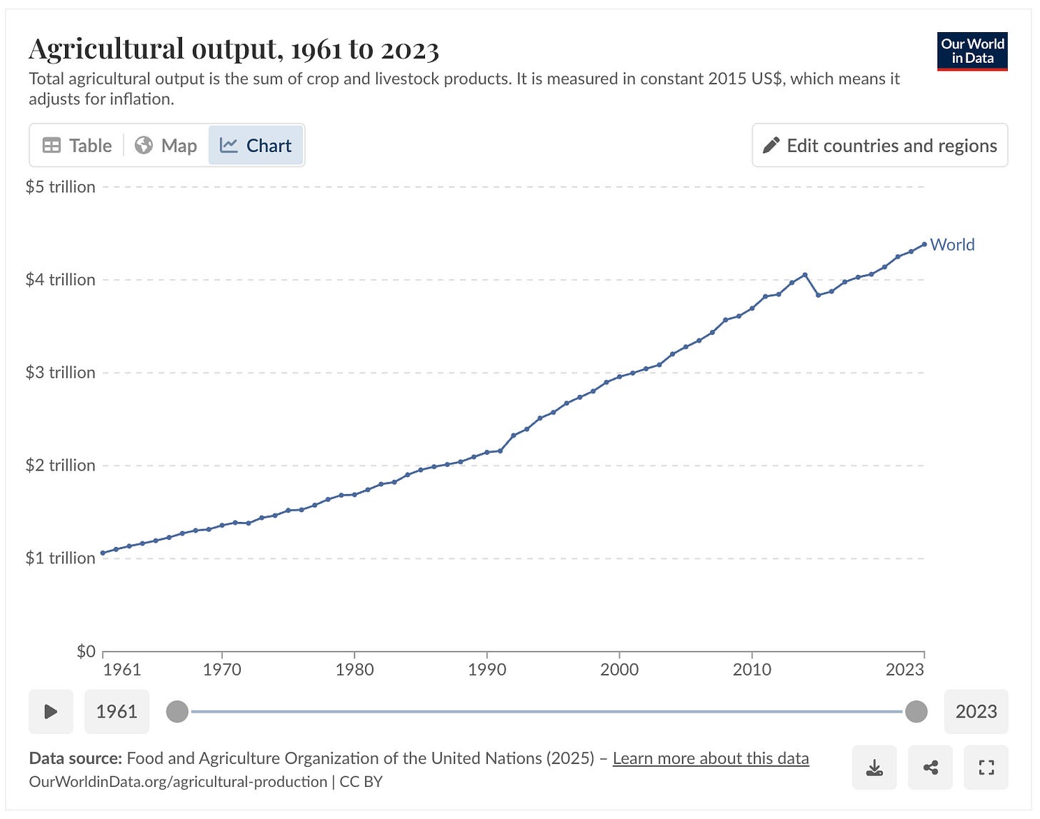 And don’t look now, but here’s more positive news... this time from Our World in Data, citing figures sourced from the United Nations Food and Agriculture Organization. Their reports show total agricultural output (adjusted for inflation) increasing by over 310% during the last six decades. That’s almost double the rate of population increase, which grew by ~160% over the same period (from ~3 billion in 1961 to ~8 billion in 2025).