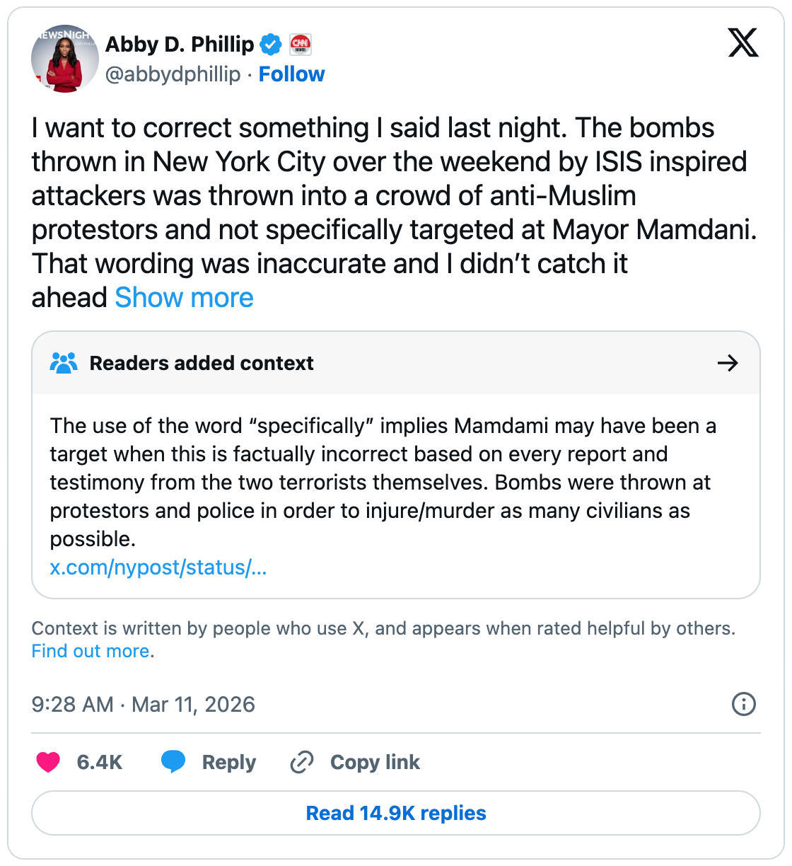 As if that weren’t bad enough, within hours of the disgraced network’s online retraction-a-thon, came CNN NewsNight’s host Abby Phillip, who went on air and “informed” viewers that the terror attack – again, the bomb thrown by ISIS devotees shouting “Allahu Akbar!” – was actually an attack, not on the protestors... but on Mayor Mamdani! (Who was not even present at the protest.)