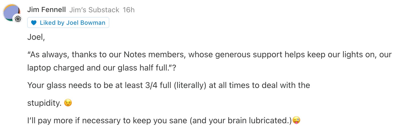 Readers who wish to join Jim and the rest of our generous Notes members, may top up our glass (and keep us sane), below...